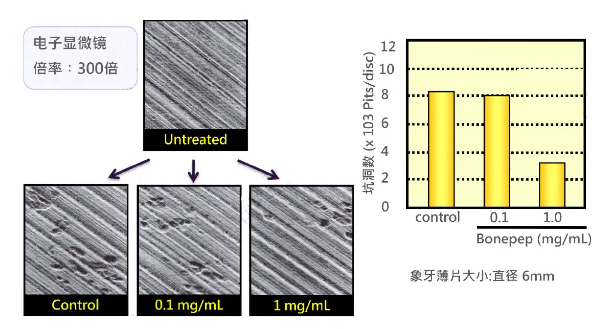注:與對(duì)照組相比,BonepeTM能抑制破骨細(xì)胞的骨吸收,顯著減少骨骼表面破損凹洞數(shù)量