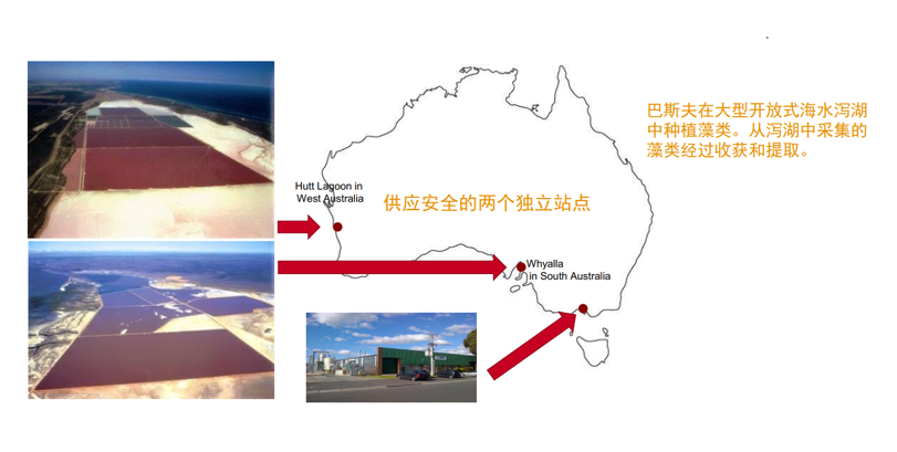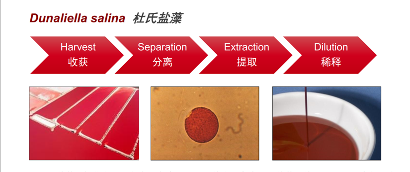 鹽藻提取物源于澳大利亞供應(yīng)商巴斯夫在東西澳大利亞兩處瀉湖種植的杜氏鹽藻,經(jīng)鹽藻種植、藻液凈化、離心分離、洗鹽脫水、提純等工藝而成。