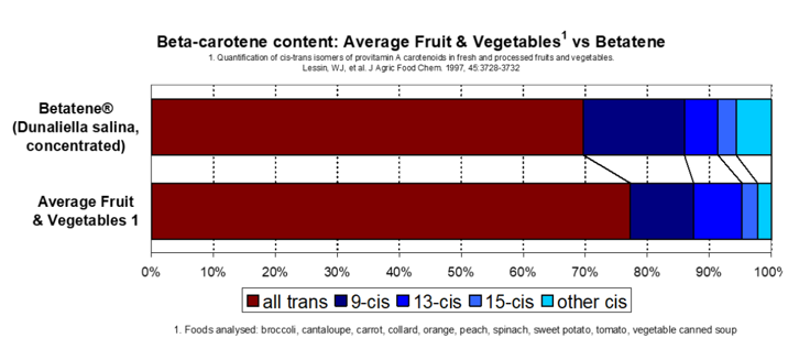 杜氏鹽藻提取物中的類胡蘿卜素混合物和β-胡蘿卜素異構(gòu)體比例為63:37,β-胡蘿卜素異構(gòu)體組成與果蔬中比例相似,并特別富含9-順式異構(gòu)體。