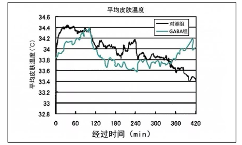 攝取GABA組和對照組在睡眠的初期皮膚溫度都有所上升。但是科學(xué)家們確認(rèn)了攝取GABA組在入睡時隨著時間推移皮膚溫度下降,而且接近起床時間時皮膚溫度回升。
